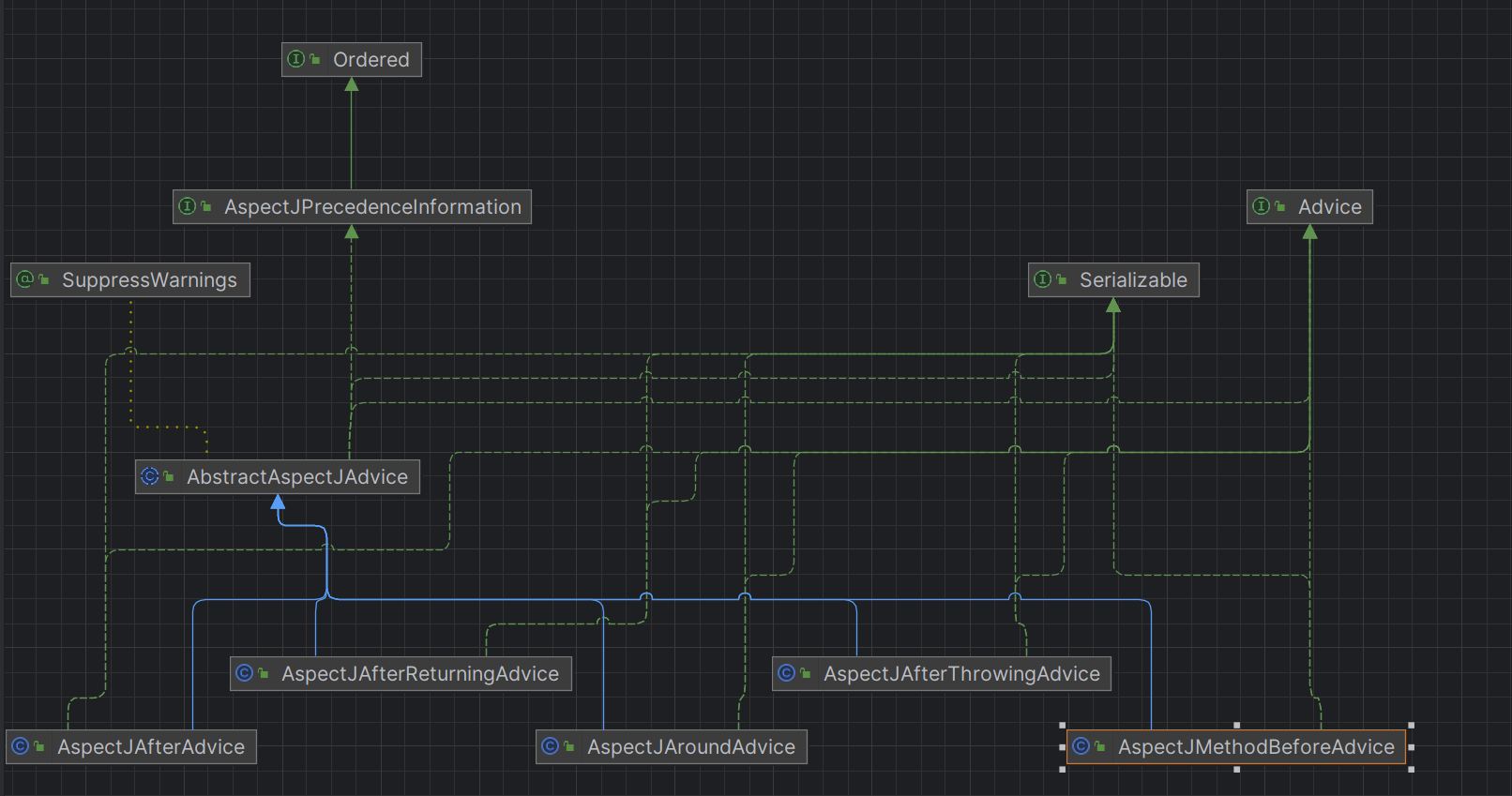 可以看到,Spring实现了五种Advice,分别对应在真正需要执行方法的不同时期执行额外逻辑,这些Advice实现类都封装了需要执行的额外逻辑。