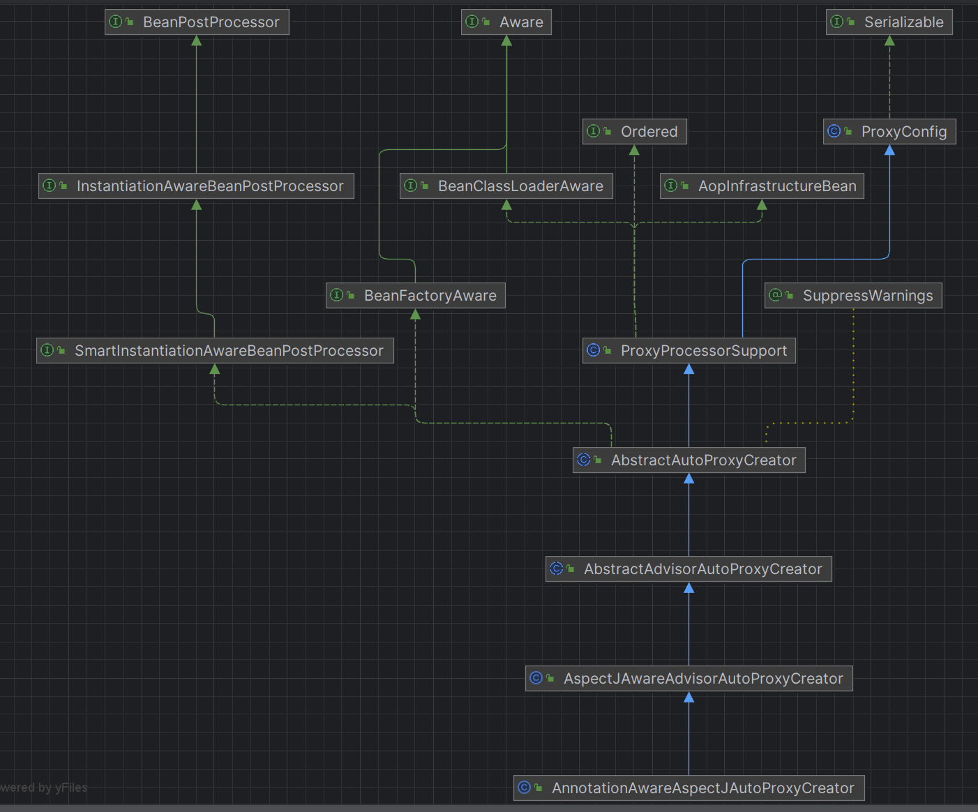 这里给出笔者的一个想法,其实spring的aop就是靠调用这两个接口来实现的,因为spring在初始化自身容器时会在不同的时机调用这两个接口的实现类,尤其是BeanPostProcessor,通过子实现去决定一个bean或者bean的方法是不是和匹配规则能苟匹配上,将匹配规则对于的额外逻辑形成一个调用链,在调用对应方法的时候判断是否需要调用额外逻辑。