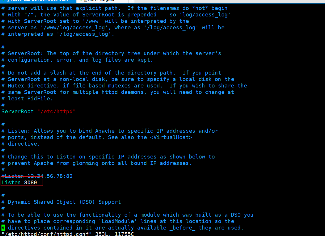 2.默认80端口被占用,可以打开httpd的配置文件修改端口,我这里就是修改为8080端口了,默认的80端口被占用了。