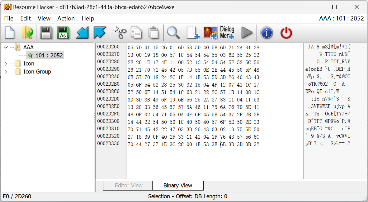 我们先用ResourcehHacker获取程序中的资源可以看到被加密的文件AAA