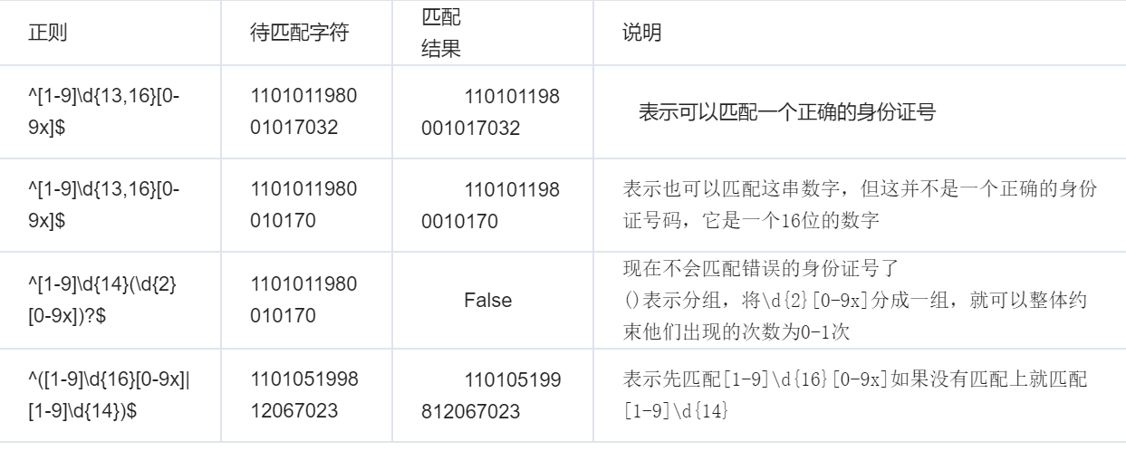 res = re.search('^[1-9](\d{14})(\d{2}[0-9x])?$','110105199812067023') # 还可以给某一个正则表达式起别名 res1 = re.search('^[1-9](?P<password>\d{14})(?P<username>\d{2}[0-9x])?$','110105199812067023')