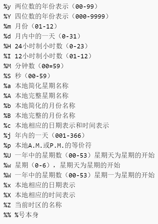 import time print(time.strftime('%Y-%m-%d')) # 2019-07-18 print(time.strftime('%Y-%m-%d %H:%M:%S')) # 2019-07-18 18:47:04 print(time.strftime('%Y-%m-%d %X')) # %X等价于%H:%M:%S print(time.strftime('%H:%M')) # 18:47 print(time.strftime('%Y/%m')) # 2019/07