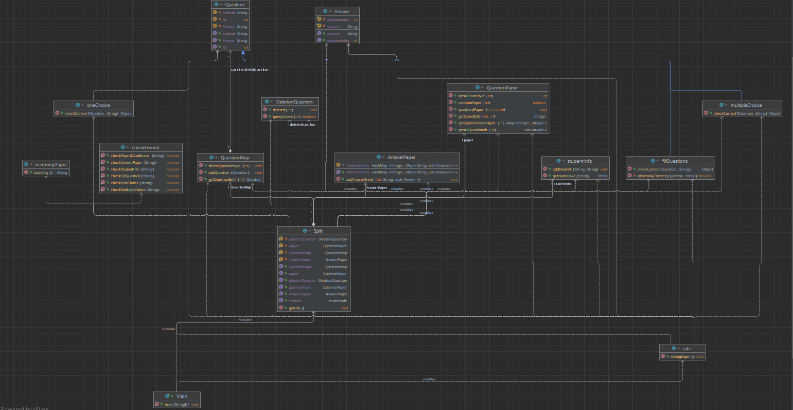 这次的代码的输入逻辑我沿用了上次大作业的逻辑,同时也增加了分割多选题和填空题的代码逻辑。把单选题,多选题,填空题抽象出来,变成了类,这三个类分别是oneChoice multipleChoice fillQuestions ,同时它们都继承至Question这个类,这个类又有id content和Answer这三个成员变量。同时还有类QuestionMap ,这个类中的成员变量private Map<Integer, Question> questionIDAndQuestion = new LinkedHashMap<>();存储所有题目的信息。