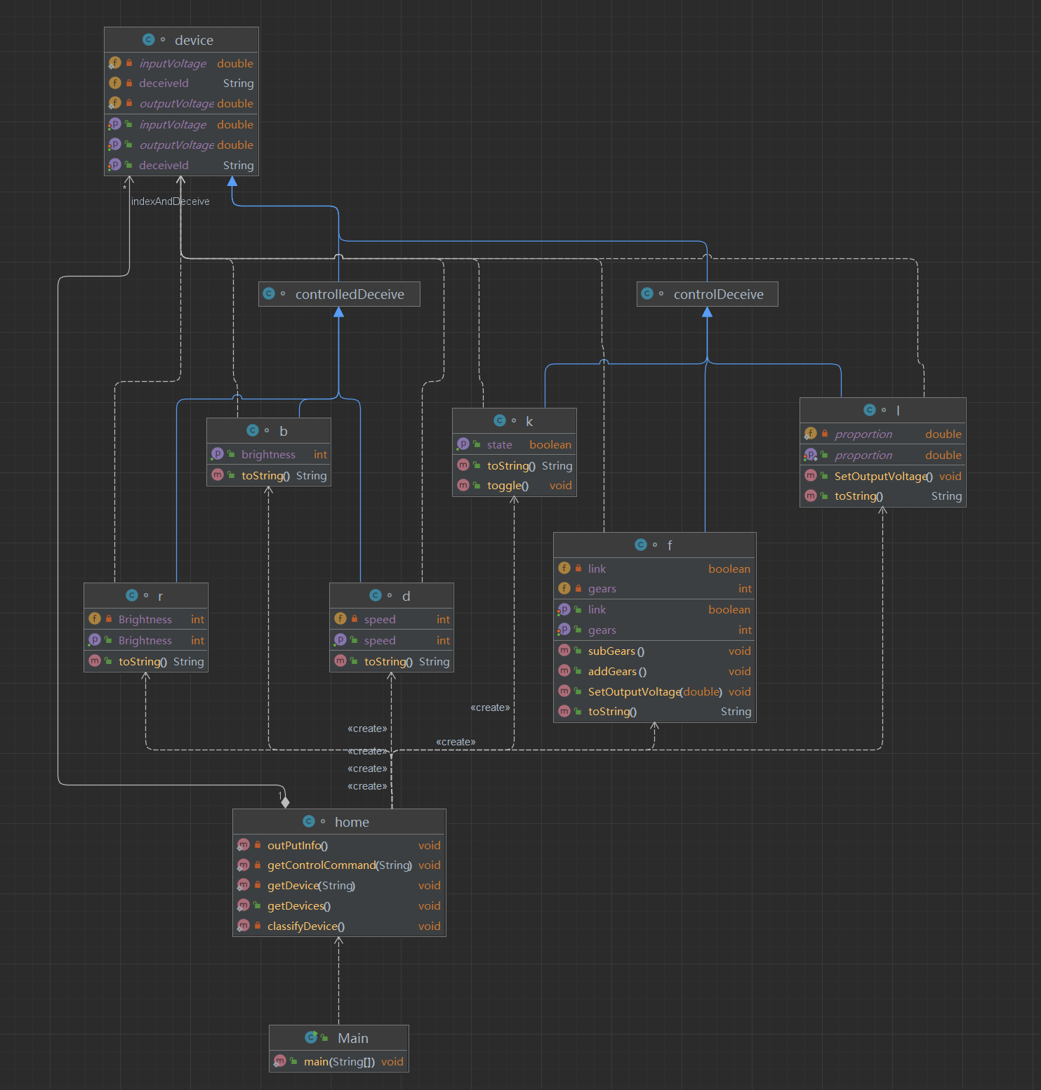 看了题目知道这是第一次迭代,比较简单。我也按照题目信息,划分了device这个类和它的子类controlDeceive还有controlledDeceive,其中controlDeceive又有子类开关k,分档调速器f,还有连续调速器l。controlledDeceive又有子类白炽灯b,日光灯r,和吊扇d。