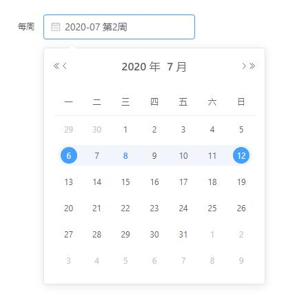 最近写的项目里面有一个功能是实现选择周的(如图 1),第一反应是使用element里面的el-date-picker组件,但是有一个问题,就是el-date-picker的周选择组件是一整年的第几周(如图 2),而不是每个月的第几周,然后就去查了一下,发现element里面也没有实现选择每个月的第几周的,那么只能自己改了。