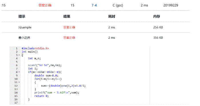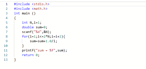 在一行中按照“sum = S”的格式输出部分和的值S,精确到小数点后6位。题目保证计算结果不超过双精度范围。