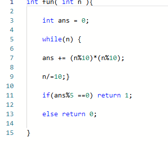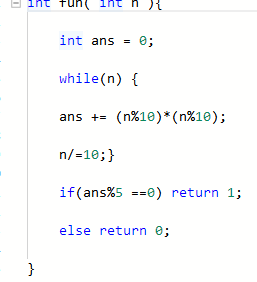编写函数fun,其功能是:判断一个整数的各位数字平方之和能否被5整除,可以被5整除则返回1,否则返回0。