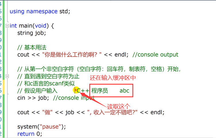 突然想到若有cin输入时,直接输入回车符等空白字符会有什么情况。经测试,程序依旧会等待输入数据,不会执行下面的程序。这是因为cin会删除缓冲区开始时的空白字符。