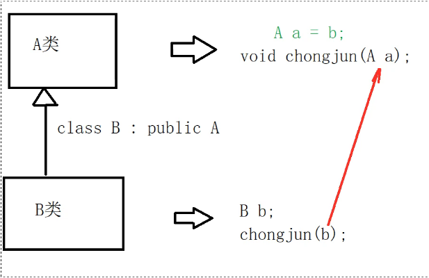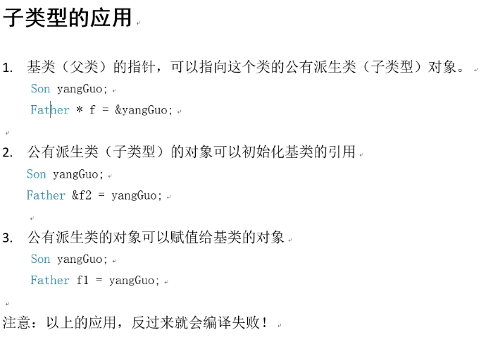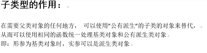 公有继承时,派生类的对象可以作为基类的对象处理,派生类是基类的子类型。子类型关系具有单向传递性(反过来不能处理)。