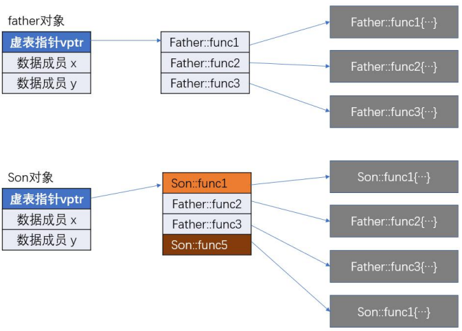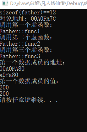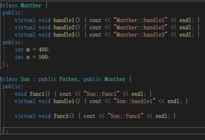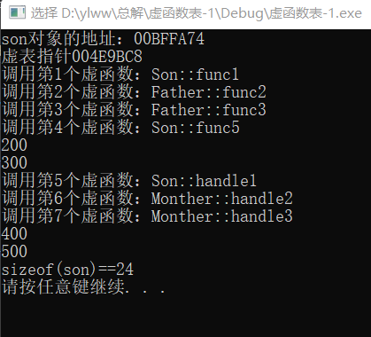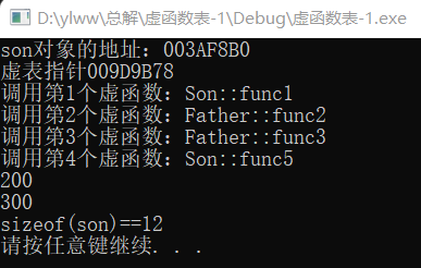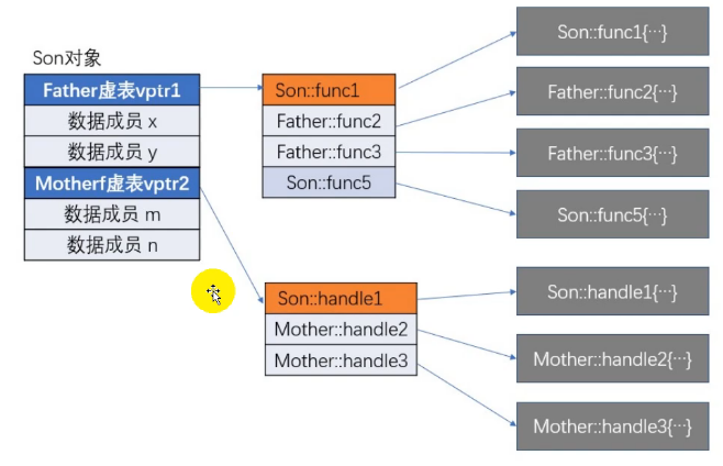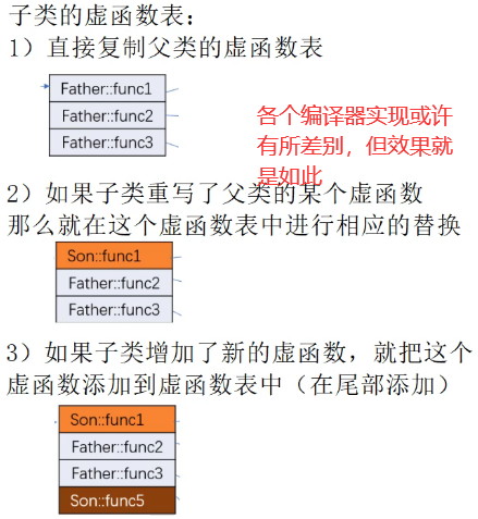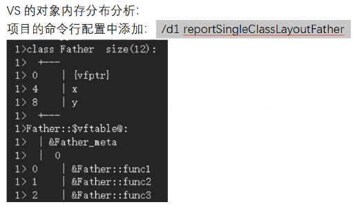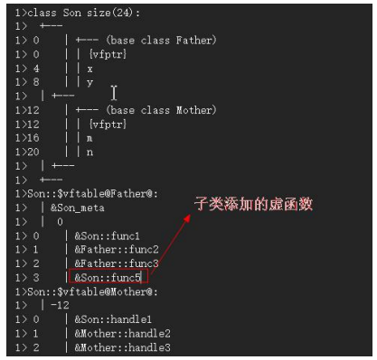vs中,多重继承时,会继承多个虚函数表(实际是虚表指针,存放顺序按照继承类的声明顺序来);