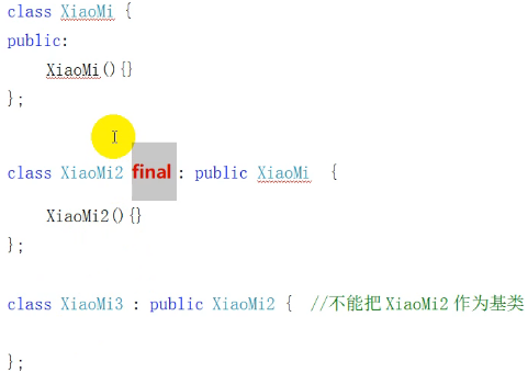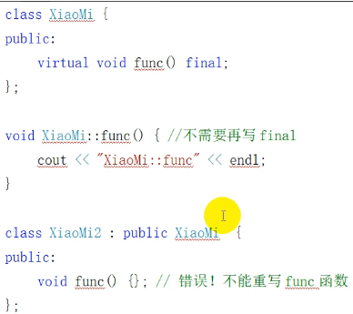 用来修饰类的虚函数,使得该虚函数在子类中,不能被重写