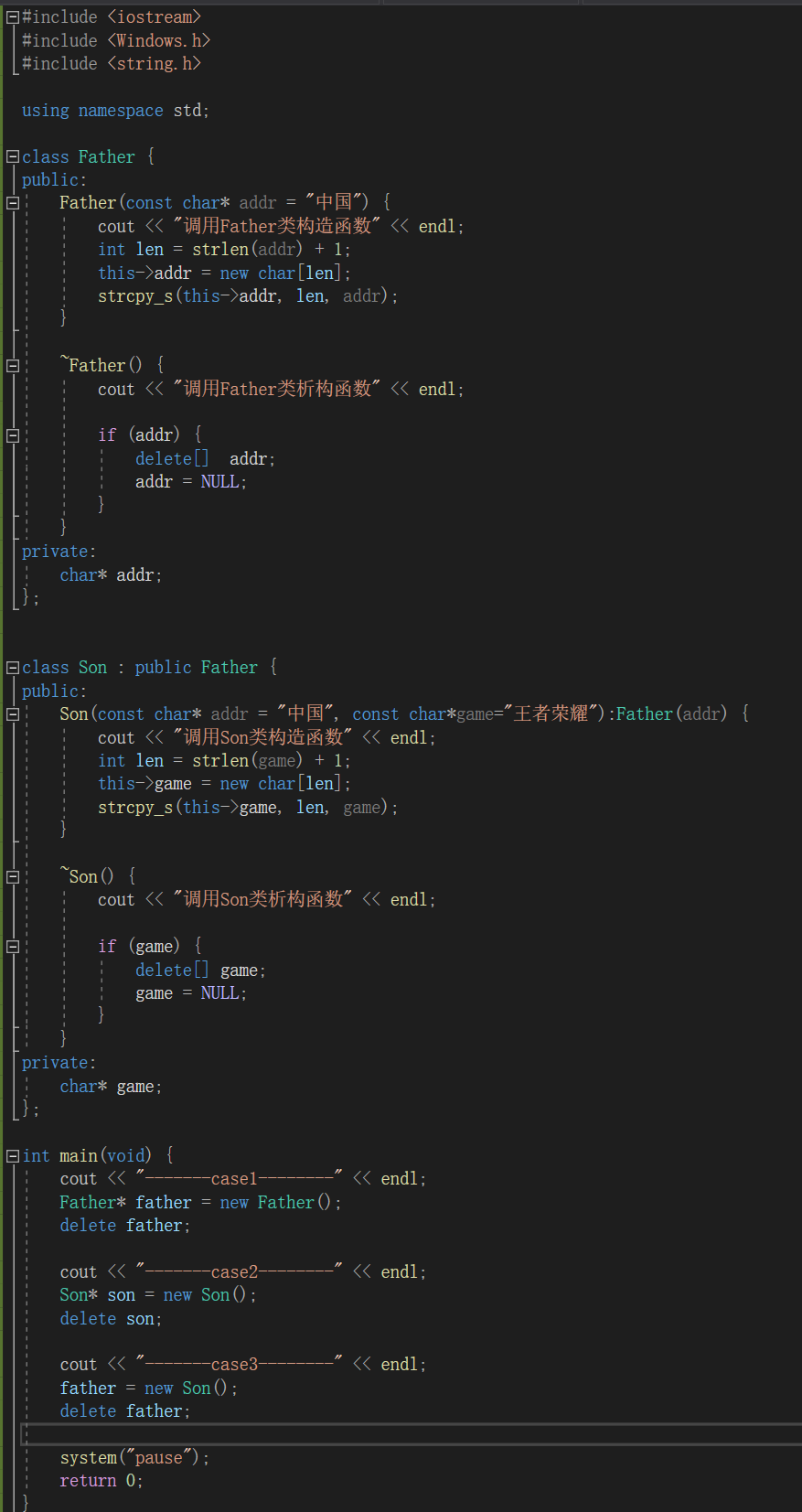 case3会导致内存泄漏。解决方法:将父类的析构函数定义成虚函数,改动代码如下: