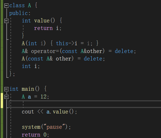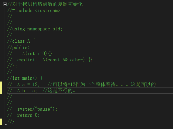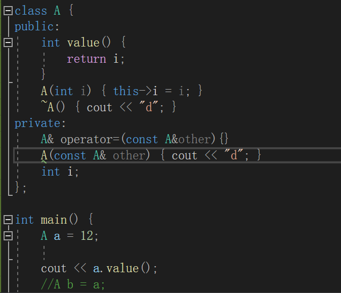 上图中,若是将拷贝构造函数的关键字改为private那么,main函数中的第一个语句也是不可行的。但可以正常运行(关于=12当作整体构造对象后由拷贝构造函数直接初始化这点有点存疑):