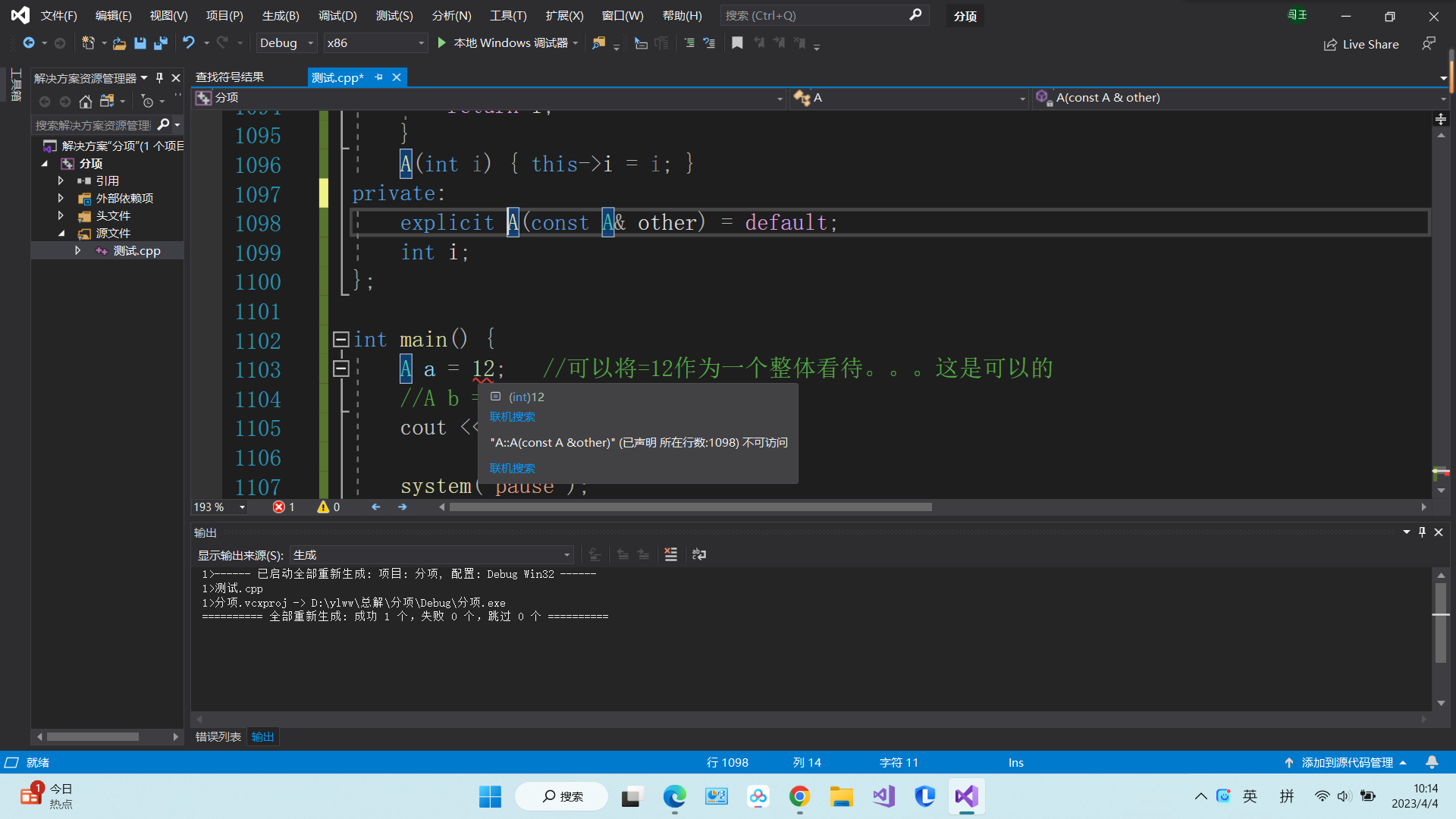 总的来说:explicit关键字的作用是明确的,但是复制初始化到底是否会生成临时变量且调用拷贝构造函数,这个要看编译器的实现。(上面注释的将=12作为一个整体,这只是一个猜想,大概率是不对的:这种情况,vs2019编译器应该不会调用拷贝构造函数,直接调用构造函数,但是在形式上,它是复制初始化,explicit会阻止复制初始化)。