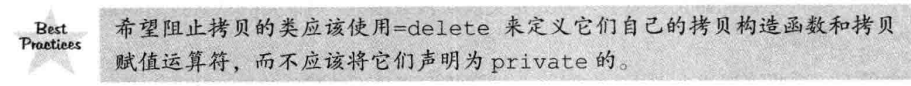 新标准发布之前,类是通过private关键字来声明拷贝构造函数和拷贝赋值运算符来阻止拷贝,现在用delete关键字来阻止,