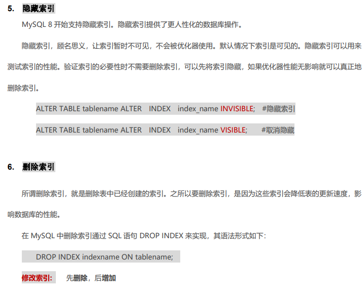 索引删除的格式不适用于主键删除,其余情况可以与删除键值(alter table tablename drop index 约束名)的语句通用。