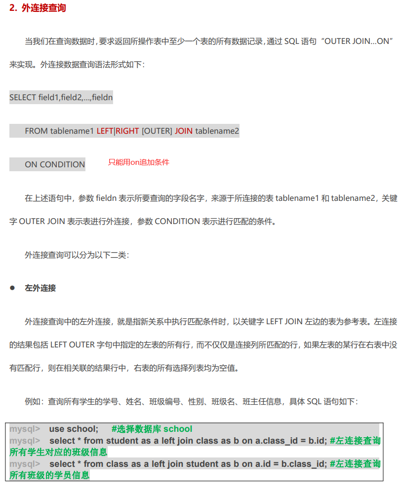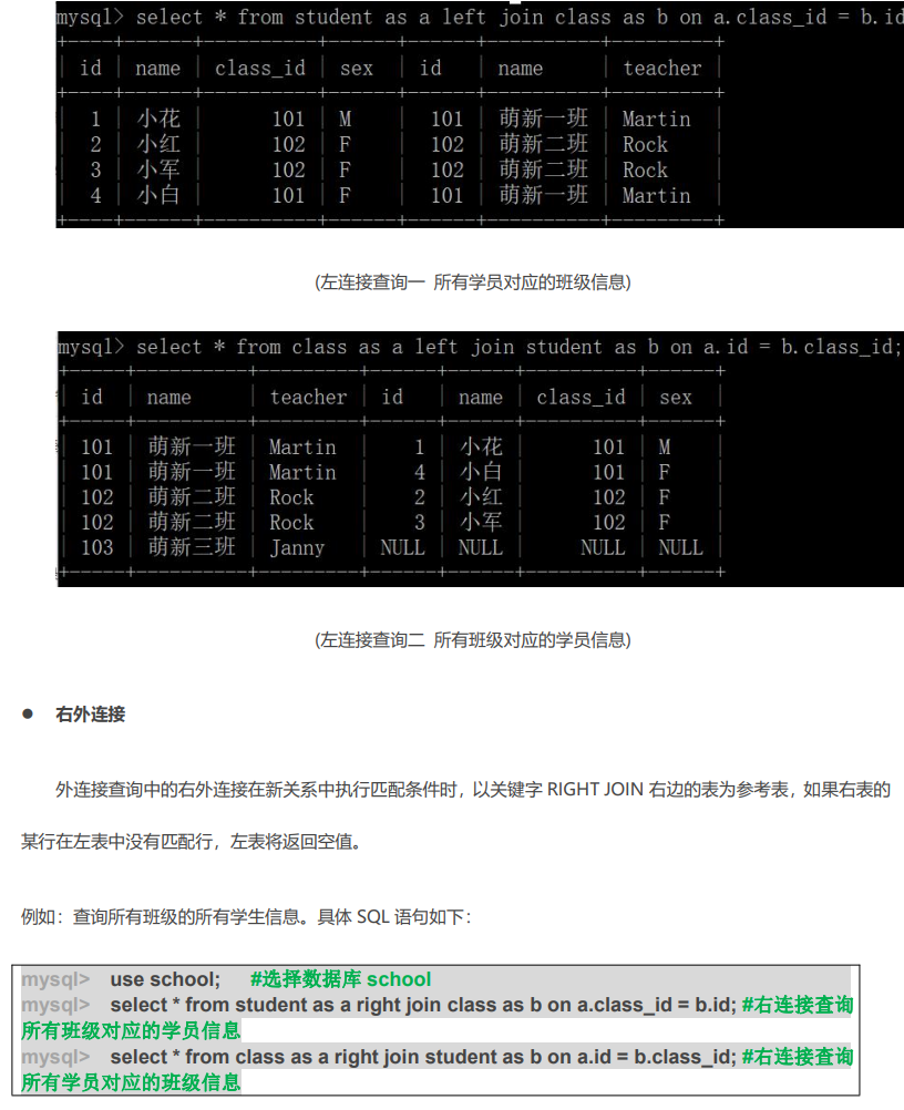 select *:左(右)连接将左(右)边出现的记录数据全部显示,若无匹配右(左)边为空。命令中左边出现的表显示在左边,右边的显示在右边。