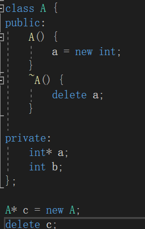 delete c做了两步工作:1.调用析构函数 2.通过析构函数释放了这个对象占据的空间。(如果析构函数中没有释放a,那么delete c会导致内存泄漏)。