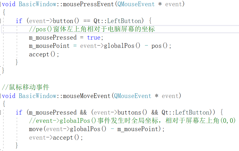 mouseMoveEvent事件会随着鼠标的移动一直更新。而鼠标按下与释放事件只是会触发,不会跟随。(重写鼠标移动事件的时候,即使什么都不做,拖住窗口上边框还是可以移动此窗口的,这要做一个区分。鼠标移动事件(默认情况下针对的是除边框区域)并不一定是窗口移动,只是随着鼠标的移动有事件更新。)