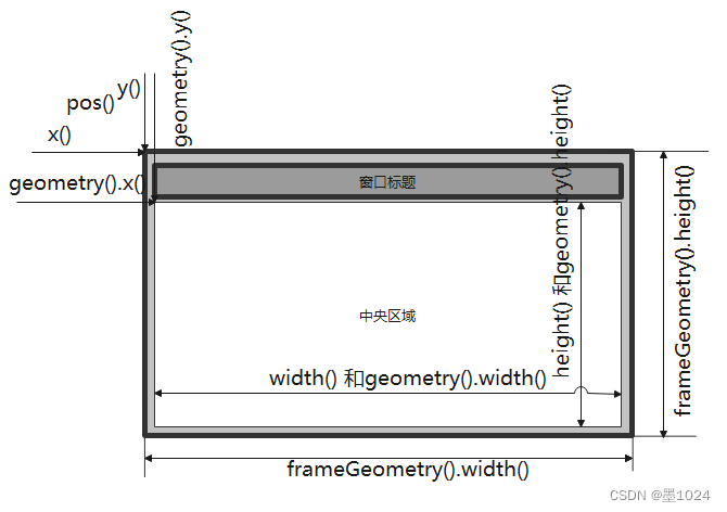 下图中,pos(),x(),y(),以及geometry()都是指这个窗口针对屏幕的坐标;而若是(一般)部件的pos()与geometry()都是(自己的左上角)针对的父级窗口(父级窗口不包括边框的那个左上点)。
