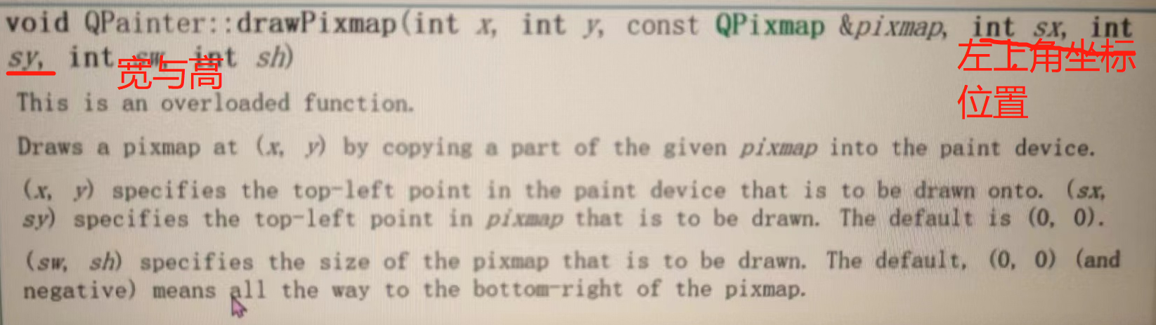 QPainter也可以在QImage上进行绘图;还有QPainter的drawPixmap方法有多个重载,其中(可以只画出图片的部分):