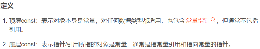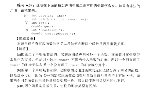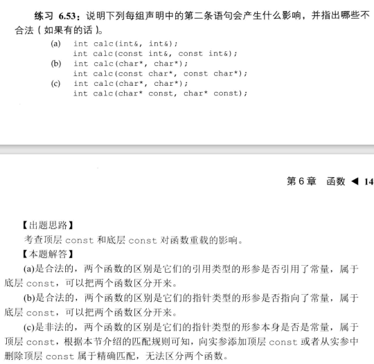 int calc(int) 与int calc(const int)并不构成重载。因为顶层const 不影响传入函数的对象,所以一个拥有顶层const的形参无法与另一个没有顶层const的形参区分开来。
