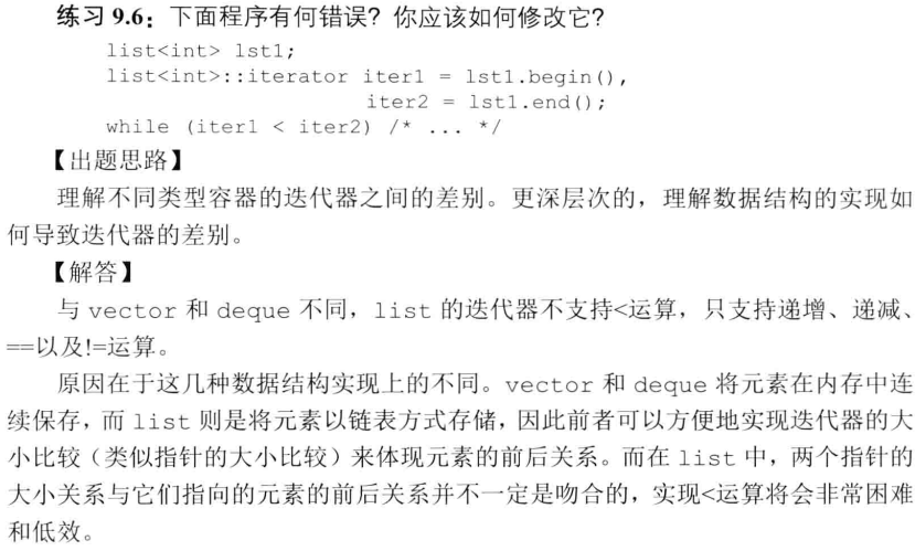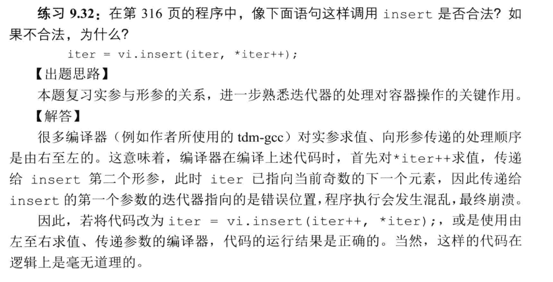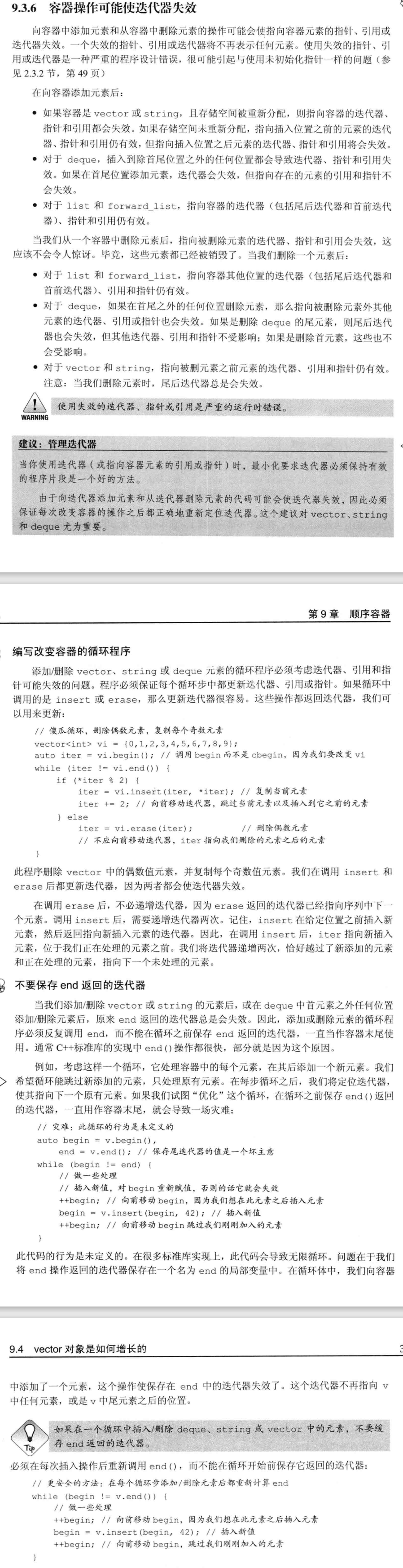向一个vector,string,deque插入元素会使现有指向容器元素的迭代器,引用和指针失效。(若插入元素后vector发生扩容,则原先所有迭代器失效)。