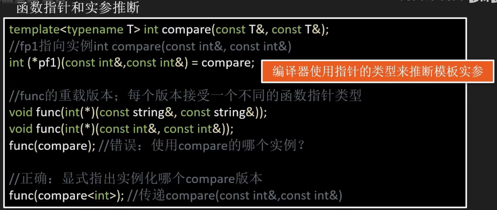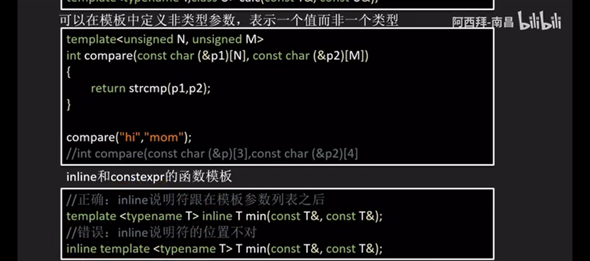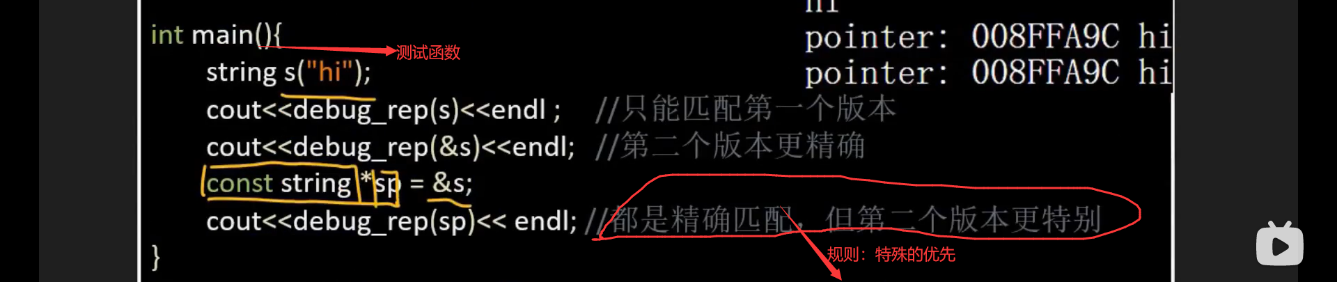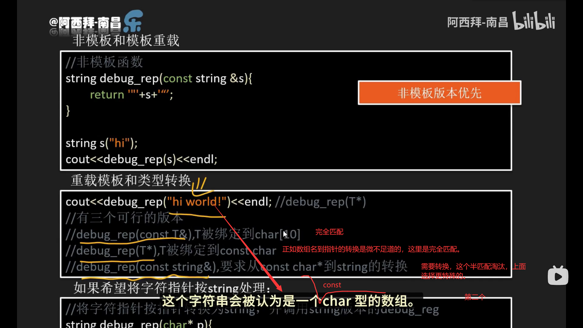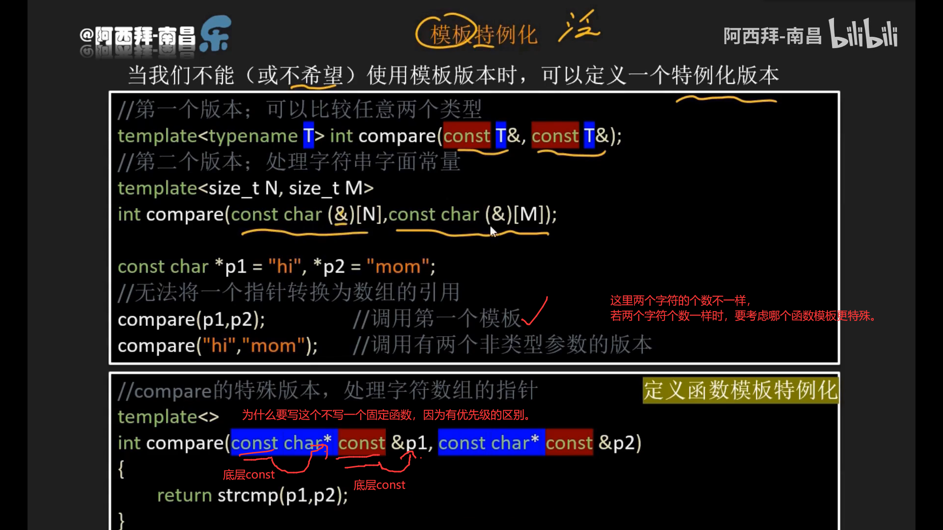 若将特例化函数模板放在函数调用之前的话:调用compare(p1,p2)将有两个版本适合,采用特例化版本;调用compare("hi","mom")也将有两个版本适合,特例化中多了个const的底层引用,但是对于cosnt char*来说这个const是顶层的,故可以精确匹配(完全匹配)特例化版本(如下)。而特例化版本也是模板,两者选特殊的,故还是会调用有两个非类型参数的版本。