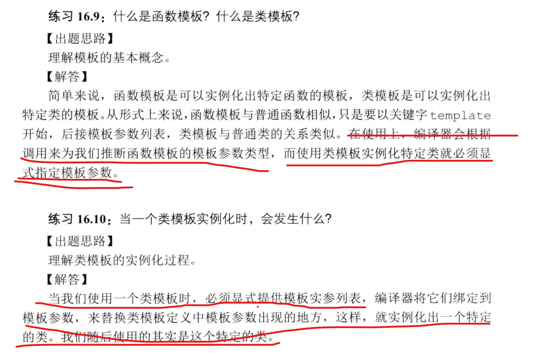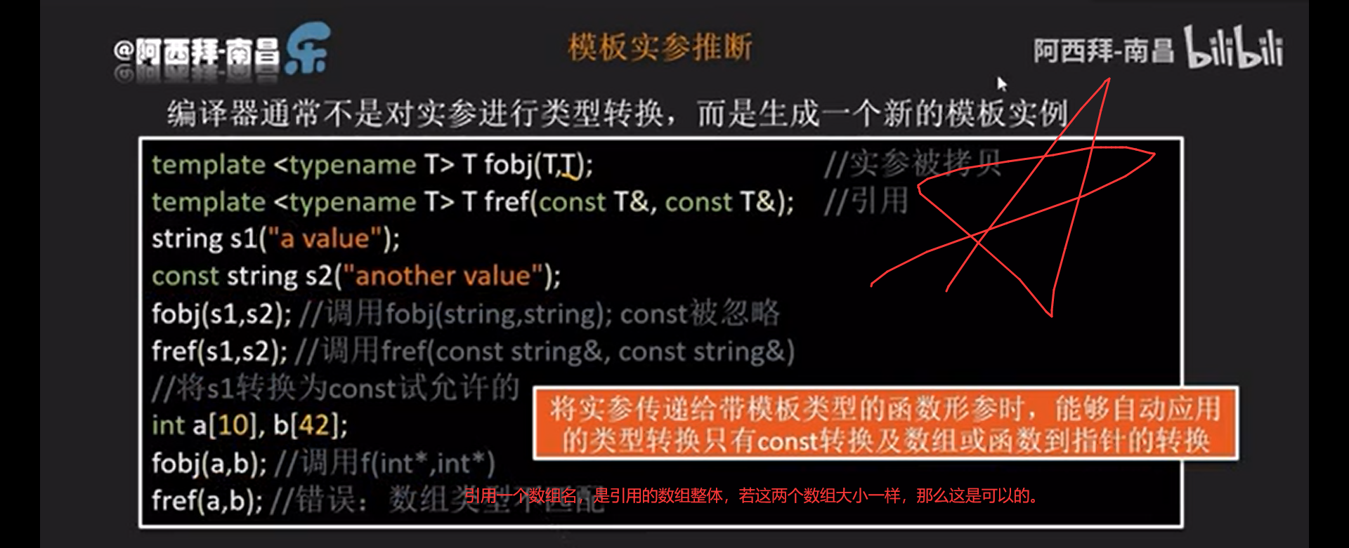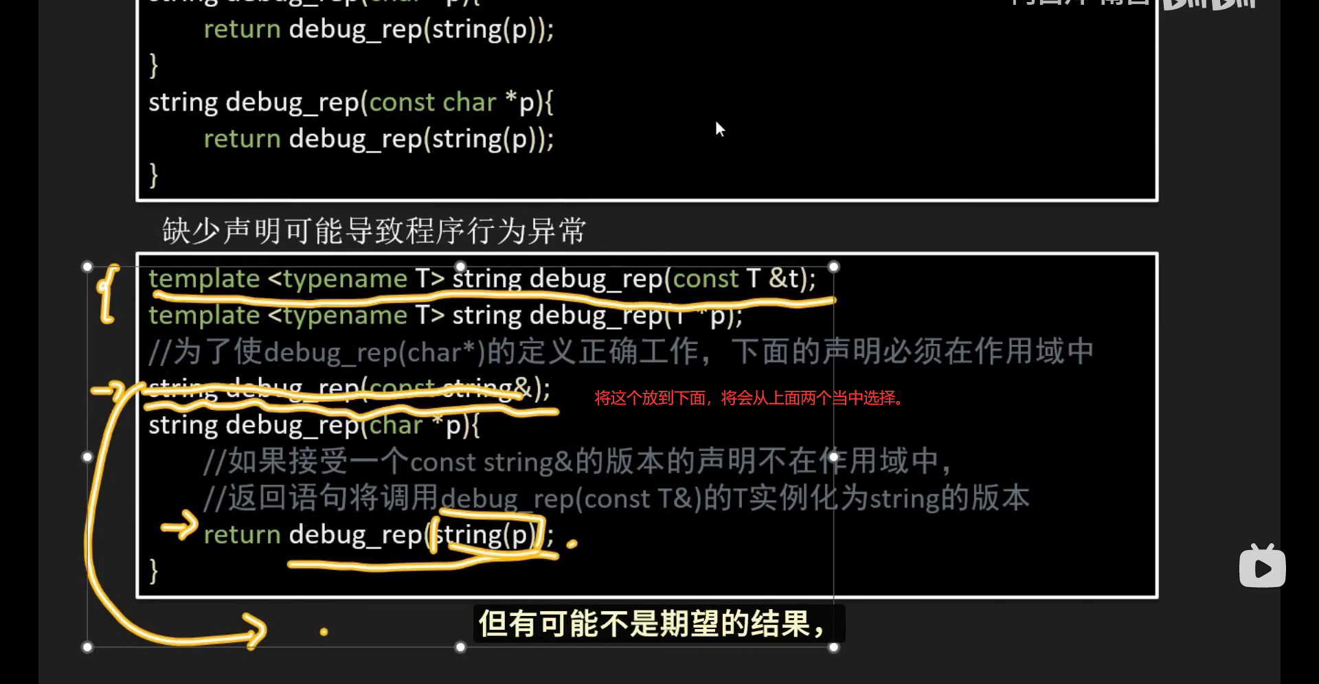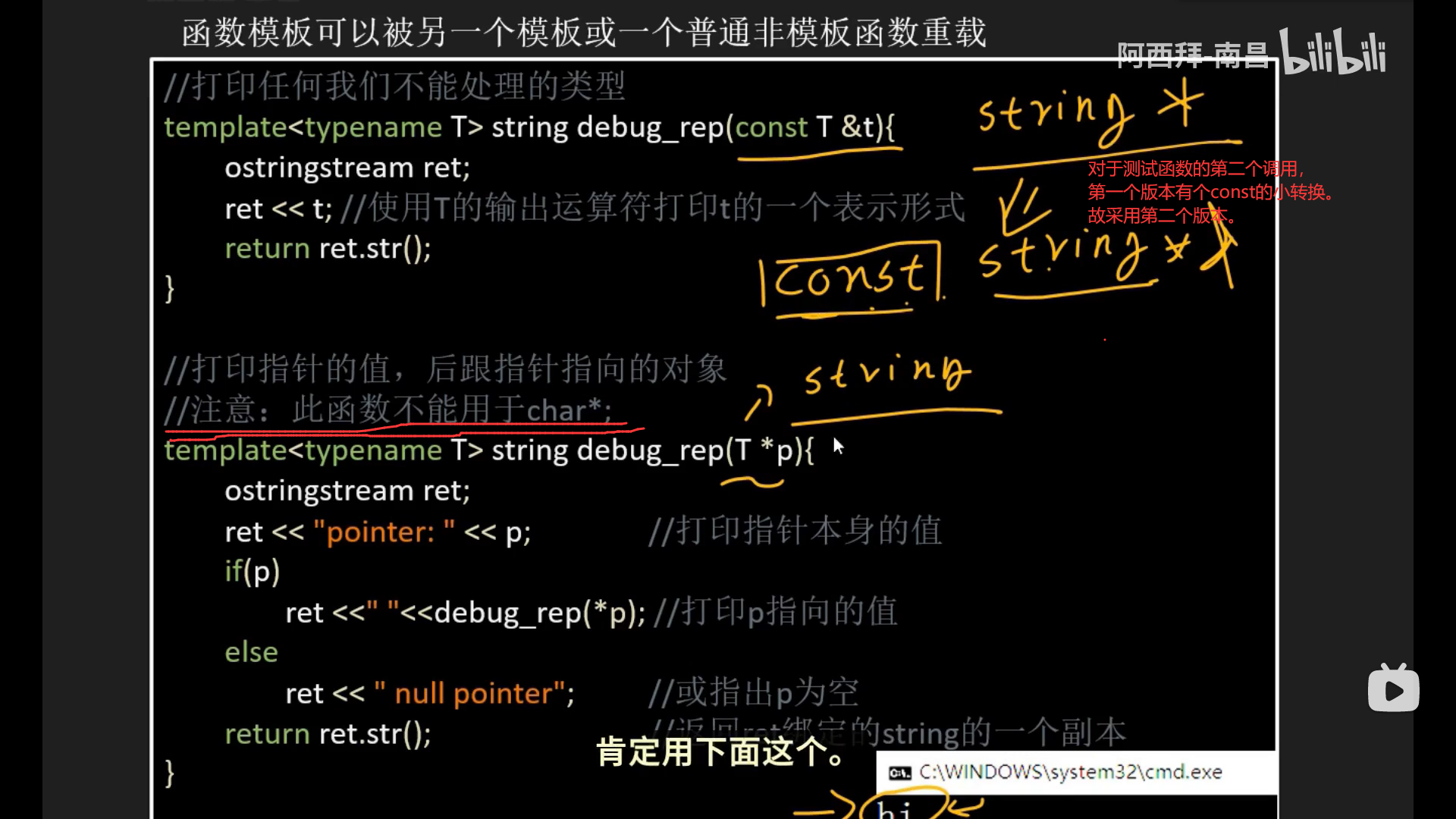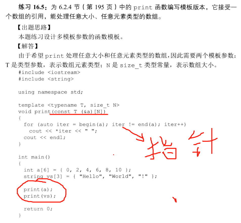 若将特例化函数模板放在函数调用之前的话:调用compare(p1,p2)将有两个版本适合,采用特例化版本;调用compare("hi","mom")也将有两个版本适合,特例化中多了个const的底层引用,但是对于cosnt char*来说这个const是顶层的,故可以精确匹配(完全匹配)特例化版本(如下)。而特例化版本也是模板,两者选特殊的,故还是会调用有两个非类型参数的版本。