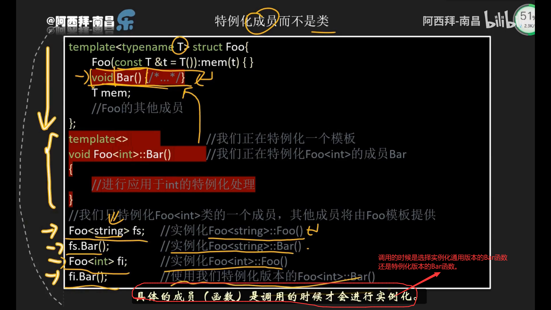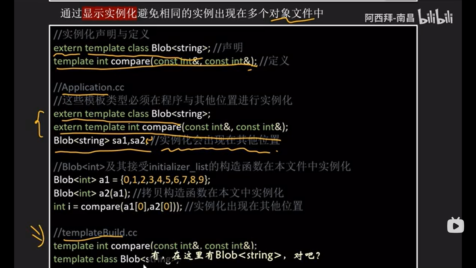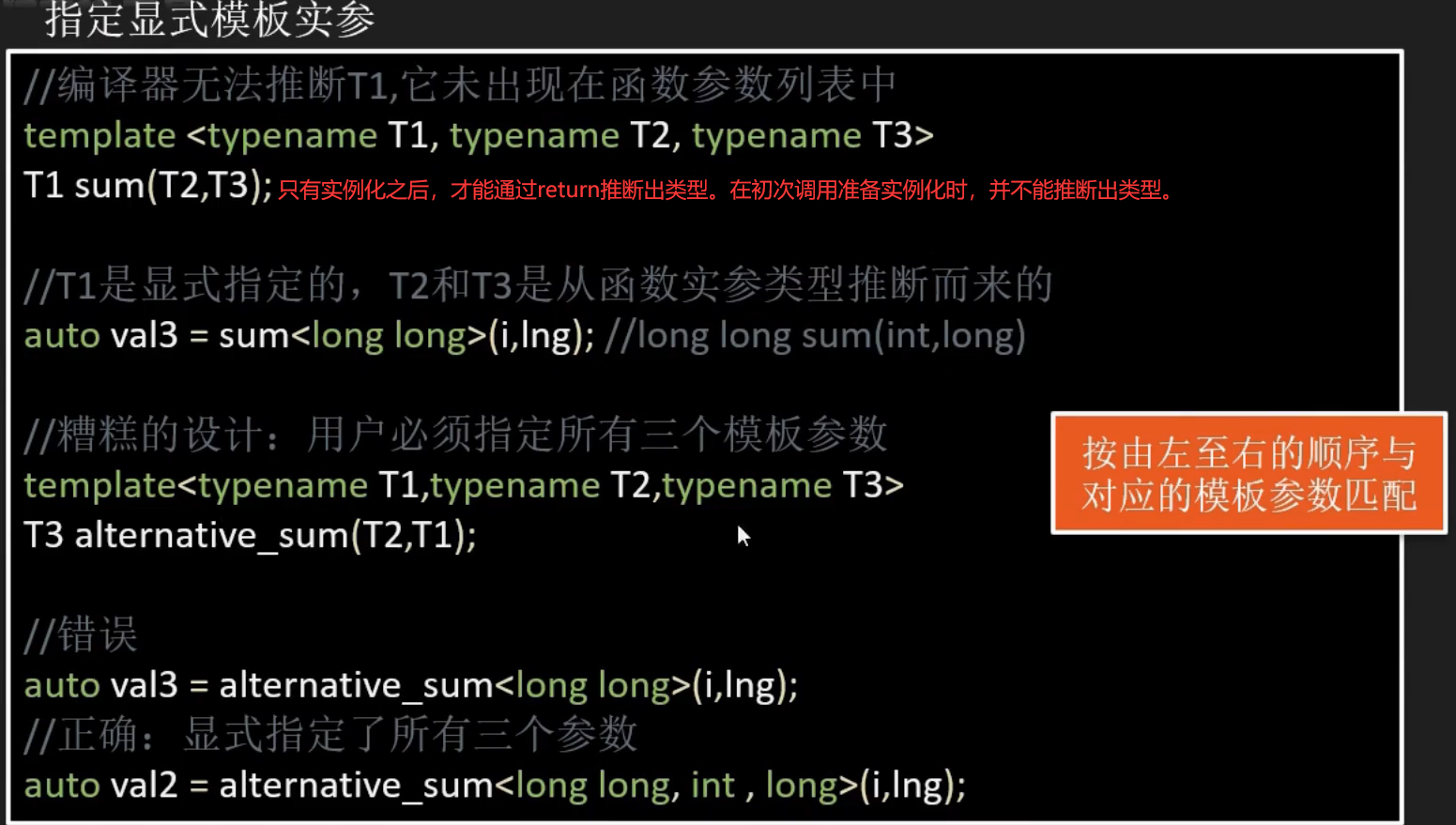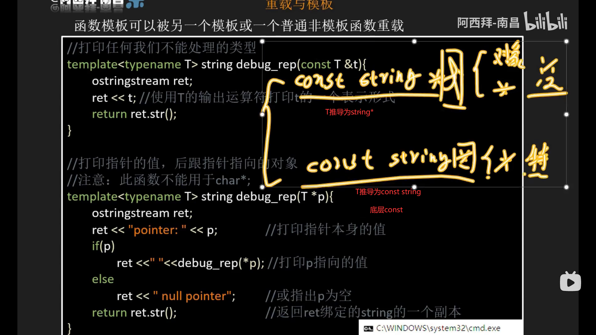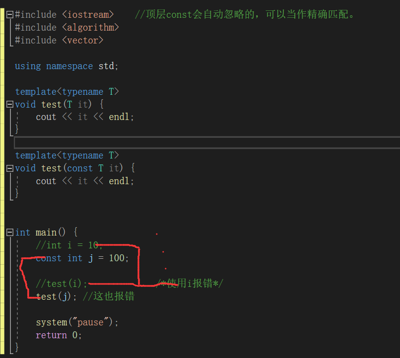 若将特例化函数模板放在函数调用之前的话:调用compare(p1,p2)将有两个版本适合,采用特例化版本;调用compare("hi","mom")也将有两个版本适合,特例化中多了个const的底层引用,但是对于cosnt char*来说这个const是顶层的,故可以精确匹配(完全匹配)特例化版本(如下)。而特例化版本也是模板,两者选特殊的,故还是会调用有两个非类型参数的版本。