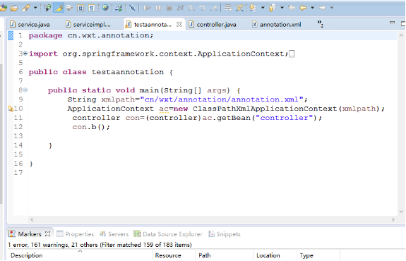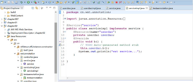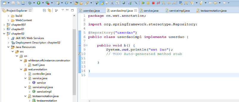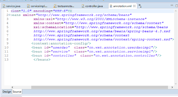 1)创建com.wxt.annotation包创建StudentDao StudentDaoImpl、StudentService、StudentServiceImpl、 StudentController 、annotation.xml
