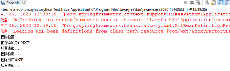 2、使用Spring框架技术的面向切面编程方法,实现对目标方法的环绕通知。请以用户管理为例(简单模拟即可),实现对用户添加和用户删除方法的环绕通知,模拟在这些方法前进行校验操作,在这些方法之后进行日志处理操作。要求编写目标类、切面类和代理工厂等组件的实现代码和配置文件,编写测试程序,运行并查看结果。