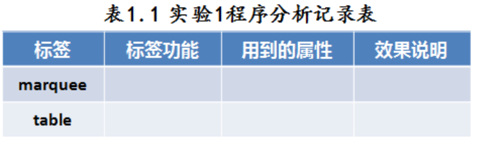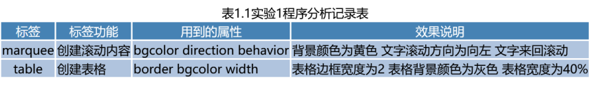(2) 理解上述HTML文档中每条语句的含义,将marquee标签及table标签的功能及其属性设置结果记录于表1.1中。