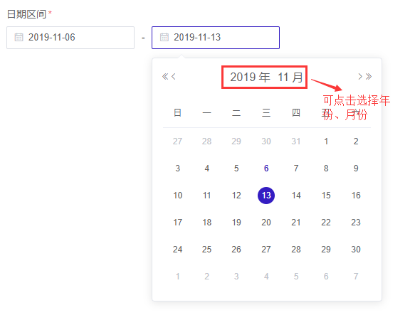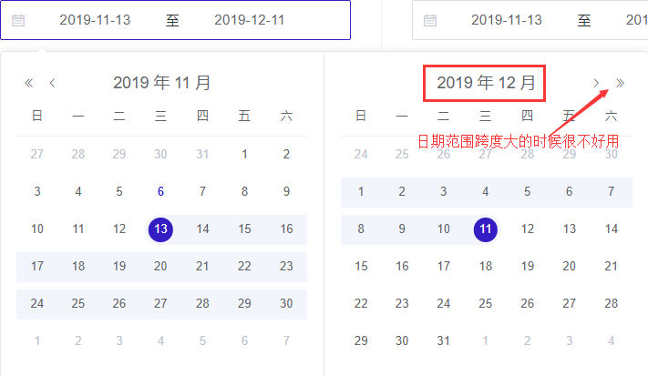 - 单个的日期选择可以先选择年份,再选择月份和日期,解决了日期跨度大选择不便