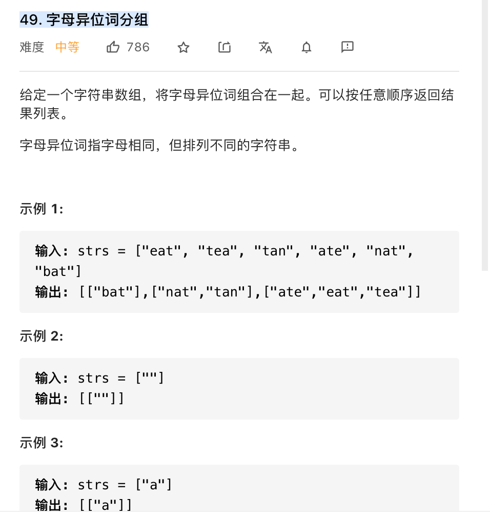 class Solution { public: vector<vector<string>> groupAnagrams(vector<string>& strs) { unordered_map<string, vector<string>> un_map; // unordered_map底层是哈希表 ,时间复杂度O(1); // map底层是平衡数O(logn) for(auto str: strs){ string key = str; sort(key.begin(), key.end()); un_map[key].push_back(str); } vector<vector<string>> res; for(auto item:un_map){ res.push_back(item.second); } return res; } };