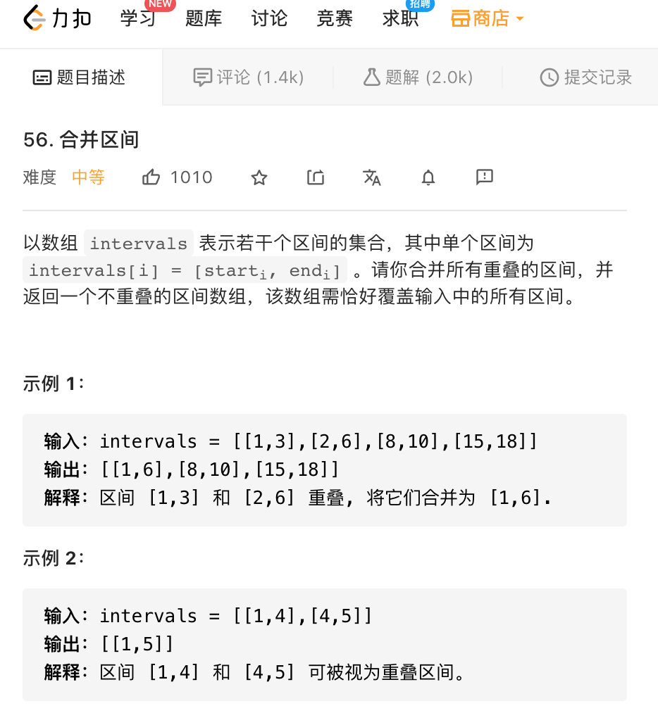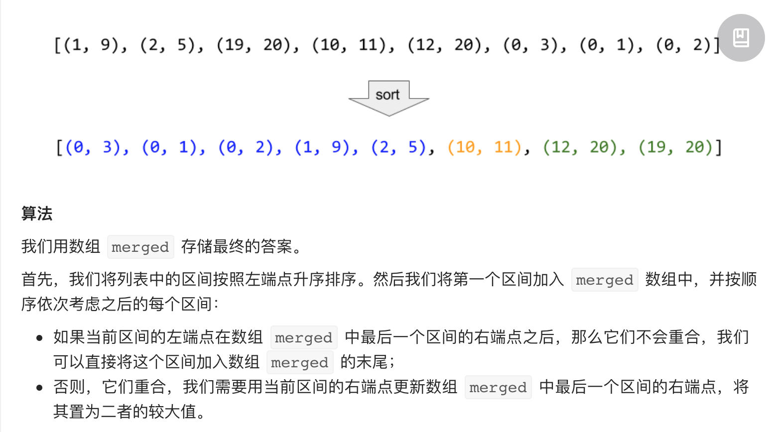 class Solution { public: vector<vector<int>> merge(vector<vector<int>>& intervals) { // 此题最关键的就是排序,如果不排序很难处理 sort(intervals.begin(), intervals.end()); // 按照左端点从小到大排序 vector<vector<int>> res; int len = intervals.size(); for(int i = 0; i < len; i++){ int L = intervals[i][0]; int R = intervals[i][1]; // 如果res中没有区间,或者当前区间的左端点比res中最后一个区间右端点大, // 说明当前区间不在res目前区间里面,则添加新区间到res中。 if(res.size()==0||res[res.size()-1][1]<L){ res.push_back({L,R}); // 直接添加一维数组的办法 }else{ // 因为当前区间在res的最后一个区间里面,所以需要更新res中最后一个区间的右端点 // 比较右端点的长度, res[res.size()-1][1] = max(res[res.size()-1][1],R); } } return res; } };