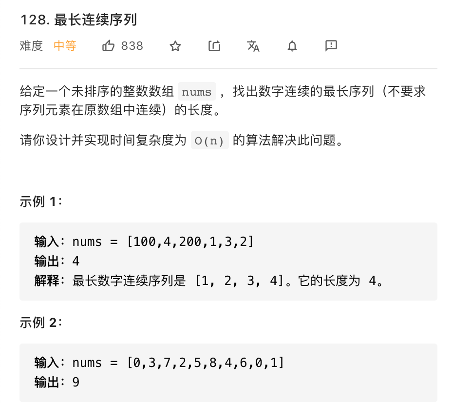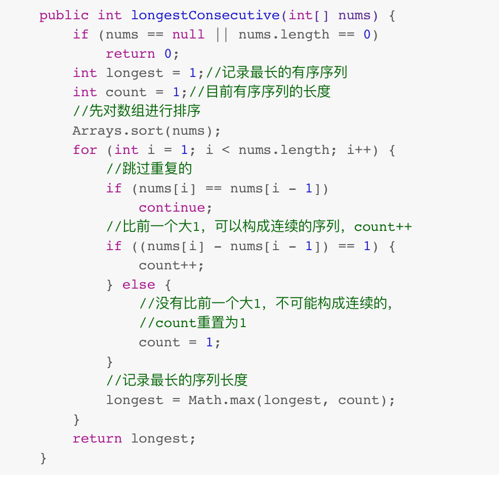 class Solution { public: int longestConsecutive(vector<int>& nums) { if(nums.size()==0) return 0; if(nums.size()==1) return 1; sort(nums.begin(), nums.end()); int sum = 0; for(int i = 0; i < nums.size()-1; i++){ int count = 1; while(i < nums.size()-1){ if(nums[i+1]-nums[i]==1){ // 连续的情况 count ++; i++; }else if(nums[i+1]-nums[i]==0){ // 可能有相等值出现的情况, i++; }else{ // 其余的情况 break; } } sum =max(sum, count); } return sum; } };