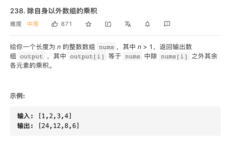 class Solution { public: vector<int> productExceptSelf(vector<int>& nums) { if(nums.size()==0) return {}; vector<int> a(nums.size(),1); vector<int> b(nums.size(),1); vector<int> c(nums.size(),1); for(int i = 1; i < nums.size(); i++){ a[i] = a[i-1]*nums[i-1]; // a[i]保存的是0到i-1的乘积 } for(int i = nums.size()-2; i>=0; i--){ b[i] = b[i+1]*nums[i+1]; // b[i]保存的是i+1到末尾的乘积 } for(int i = 0; i < nums.size(); i++){ c[i] = a[i]*b[i]; // c[i] 刚好等于a[i]*b[i] } return c; } };
