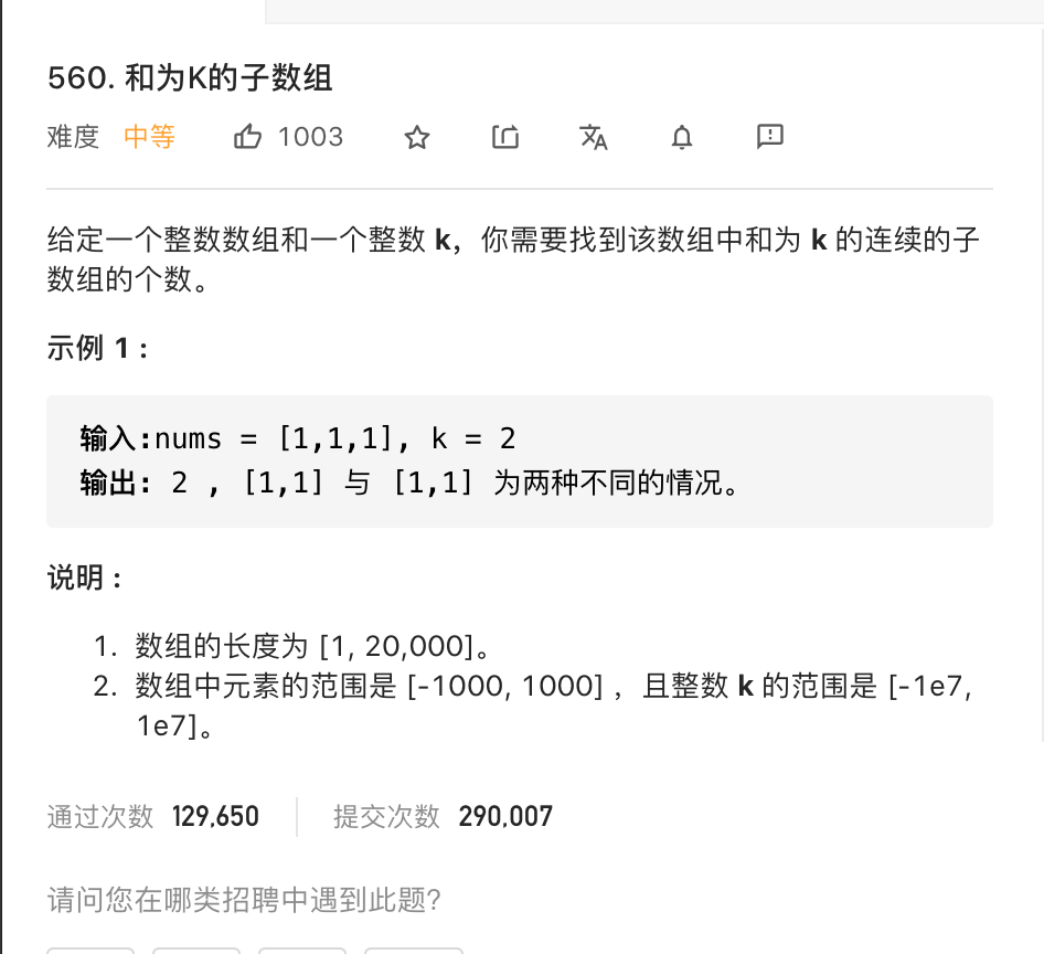 // class Solution { // public: // int subarraySum(vector<int>& nums, int k) { // // 前缀和 // // 超时 // vector<int> pre(nums.size()+1,0); // pre[0] = 0; // for(int i = 0; i < nums.size(); i++){ // pre[i+1] = pre[i] + nums[i]; // } // int count = 0; // for(int i = 0; i < nums.size(); i++) // for(int j = i; j < nums.size(); j++){ // if(pre[j+1]-pre[i] == k) // count++; // } // return count; // } // }; class Solution { public: int subarraySum(vector<int>& nums, int k) { // 前缀和 // 超时 unordered_map<int,int> in_map; int pre = 0; int count = 0; in_map[0] = 1; // 避免了in_map.find(0)找不到的现象 for(int i = 0; i < nums.size(); i++){ pre = pre + nums[i]; // 前缀和 if(in_map.find(pre-k)!=in_map.end()){ //count = count + 1; count = count + in_map[pre-k]; // 为什么不用上面一个,因为前缀和可能有多个序列等于同一个值。 } in_map[pre]++; } return count; } };