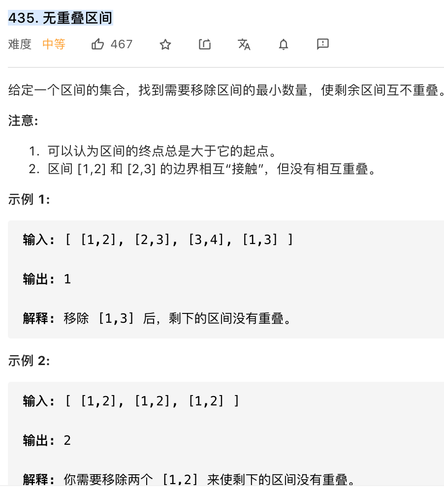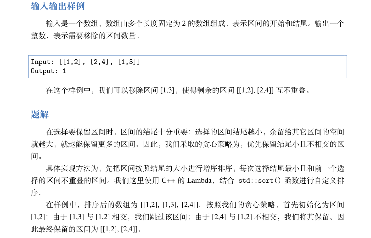 class Solution { public: // 注意必须加上&符号,不然超时报错,因为加引用是地址传递, // 不加会创建一个新的变量,和原来的变量指向同一个地址 static int cmp(vector<int> &a, vector<int> &b){ return a[1]<b[1]; } int eraseOverlapIntervals(vector<vector<int>>& intervals) { sort(intervals.begin(), intervals.end(),cmp); int sum = 0; int prev = intervals[0][1]; // 存储排序过后尾区间最小的元素 for(int i = 1; i < intervals.size(); i++){ if(intervals[i][0]<prev){ sum++; }else{ prev = intervals[i][1]; } } return sum; } };