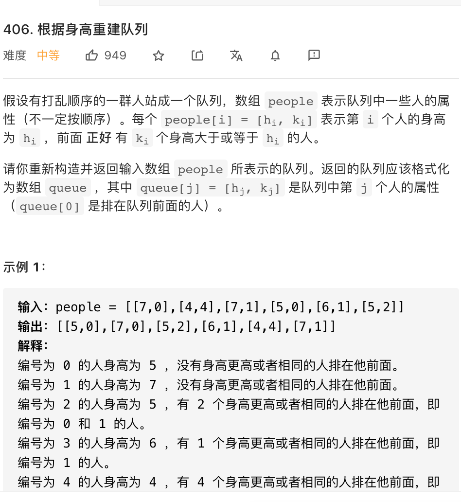 class Solution { public: static bool cmp(vector<int> &a, vector<int> &b){ if(a[0] != b[0]) // 第一个元素不等,先按照第一个元素从大到小排序 return a[0]>b[0]; else return a[1]<b[1]; // 第一个元素相等,在第一个元素从大到小排序基础上,将第二个元素按照从小到大排列 } vector<vector<int>> reconstructQueue(vector<vector<int>>& people) { sort(people.begin(), people.end(),cmp); // vector<vector<int>> res(people.size(),vector<int>(2)); vector<vector<int>> res; for(int i = 0; i < people.size(); i++){ res.insert(res.begin()+people[i][1],people[i]); } return res; } };