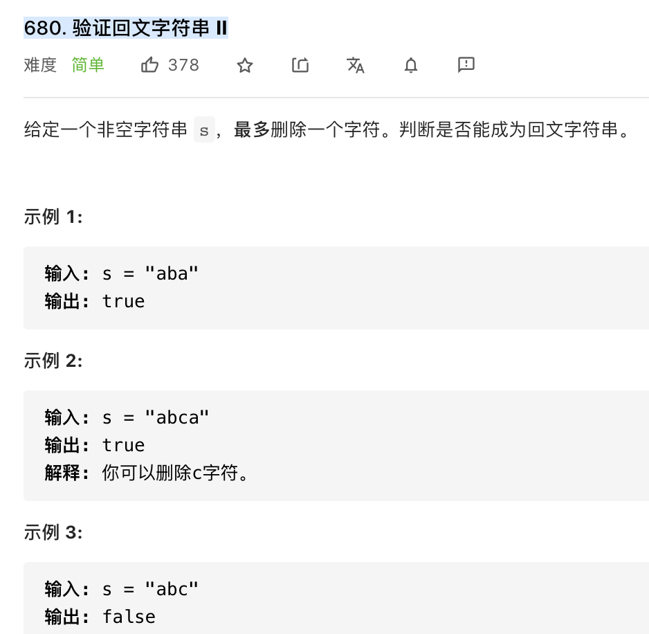 class Solution { public: bool validPalindrome(string s) { int i = 0; int j = s.size()-1; int cnt = 0; while(i<j){ if(s[i]!=s[j]){ return isbool(s, i+1,j)||isbool(s, i,j-1); } i++; j--; } return true; } bool isbool(string s, int i, int j){ while(i<j){ // 为什么里面不再次递归呢,因为validPalindrome已经一次不等了,删了一个元素 // 这里再次不等,肯定不是回文了,题目要求是最多删除一个元素。 // 如果再次递归就意味着不只删除一个元素 if(s[i]!=s[j]) return false; i++; j--; } return true; } };