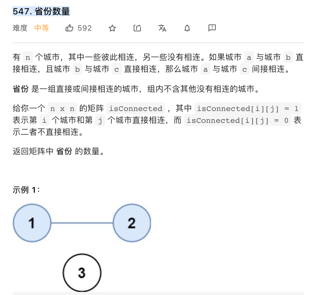 class Solution { public: int findCircleNum(vector<vector<int>>& isConnected) { int count = 0; int m = isConnected.size(); vector<bool> visited(m,false); for(int i = 0; i < m; i++){ if(!visited[i]){ // 因为visiter是引用传递,下面访问过的值会改变 dfs(isConnected,i,visited); count++; } } return count; } void dfs(vector<vector<int>>& isConnected, int i, vector<bool> &visited){ visited[i] = true; // 🦔标记访问过 for(int k = 0; k < isConnected.size(); k++){ // 将i作为横坐标,这一行都是与他相连的城市,用for循环遍历 // 在判断与其相连的城市是否访问过,通过!visited[k]判断 if(isConnected[i][k]==1&&!visited[k]){ dfs(isConnected,k,visited); } } } };