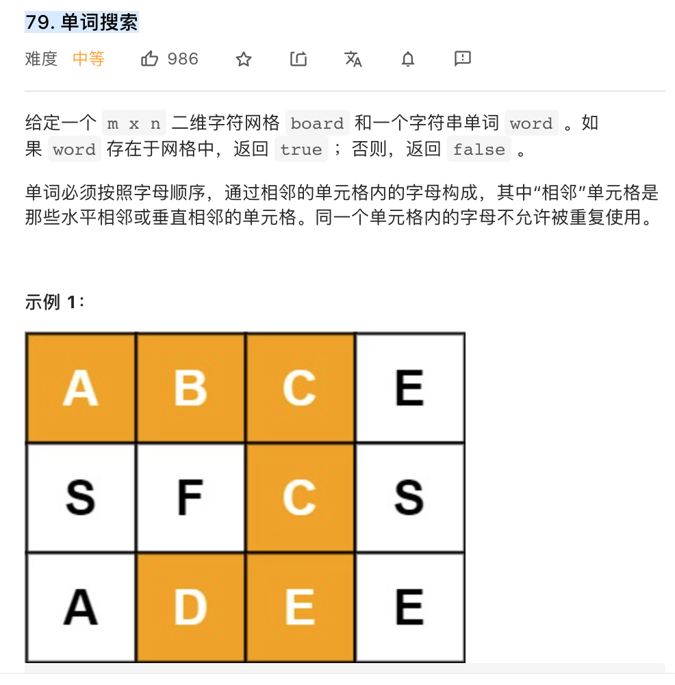class Solution { public: bool exist(vector<vector<char>>& board, string word) { int m = board.size(); int n = board[0].size(); bool res = false; vector<vector<bool>> visited(m, vector<bool>(n, false)); for(int i = 0; i < m; i++) for(int j = 0; j < n; j++){ if(board[i][j] == word[0]){ if(back(board, visited,word,i,j,0)) // 对首字母一样的,开始遍历 return true; } } return false; } bool back(vector<vector<char>>& board, vector<vector<bool>> &visited, string word,int i, int j, int index){ int m = board.size(); int n = board[0].size(); if(i>=m||i<0||j>=n||j<0||visited[i][j]) return false; bool res; if(board[i][j]!=word[index]) return false; else{ visited[i][j]=true; //cout<<"i: "<<i<<" j: "<<j<<" "<<board[i][j]<<" ====index: "<<index<<endl; if(index==word.size()-1) return true; res = back(board,visited,word,i+1,j,index+1)||back(board,visited,word,i-1,j,index+1)||back(board,visited,word,i,j+1,index+1)||back(board,visited,word,i,j-1,index+1); visited[i][j] = false; } return res; } };