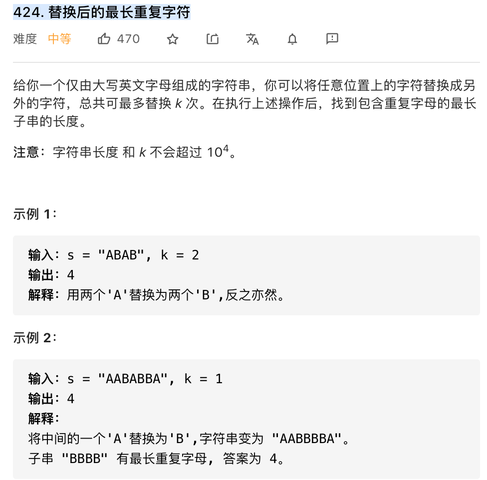 class Solution { public: int characterReplacement(string s, int k) { unordered_map<char,int> un_map; int left = 0; int res = 0; int maxval = 0; for(int right = 0; right < s.size(); right++){ un_map[s[right]]++; maxval = max(maxval,un_map[s[right]]); // 找出当前区间内字母出现最大的次数 // right-left+1是当前区间元素个数 // k+maxval是替换k个字符后,频次最多的个数 while(right-left+1>k+maxval){ // 替换k个字符后仍含有不同字符,收缩区间 un_map[s[left]]--; // 频次减一,收缩区间 left++; // 左指针右移 } // right++; // right-left+1肯定不超过k+maxval,因为如果大于,上面的while循环会收缩区间 res = max(res, right-left+1); } return res; } };