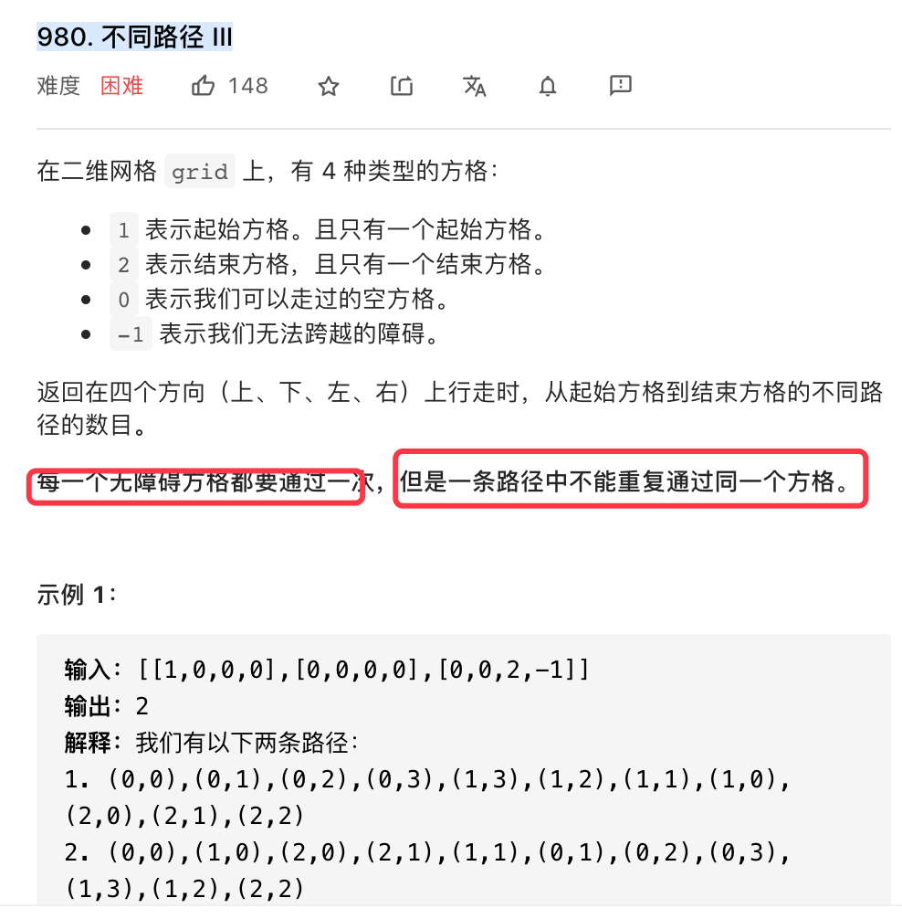 class Solution { public: //vector<vector<int>> res; int res = 0; int count_0 = 0; int uniquePathsIII(vector<vector<int>>& grid) { int m = grid.size(); int n = grid[0].size(); vector<vector<bool>> visited(m,vector<bool>(n,false)); int ii = 0; int jj = 0; int count = 0; for(int i = 0; i < m; i++) for(int j =0; j < n; j++){ if(grid[i][j]==1){ // 记录1的下标 ii = i; jj = j; } if(grid[i][j]==0){ // 统计0的值 count_0++; } } dfs(grid, ii, jj, visited, 0); return res; } void dfs(vector<vector<int>>& grid, int i, int j, vector<vector<bool>> visited,int count){ int m = grid.size(); int n = grid[0].size(); if(i<0||i>=m||j<0||j>=n||grid[i][j]==-1||visited[i][j]) return; // 当grid[i][j] == 2时,count的值时0的值加上一个2的值,所以count == count_0+1 if(grid[i][j] == 2&&count == count_0+1){ // res.push_back(temp); res++; return; } visited[i][j] = true; //cout<<" i "<<i<<" j: "<<j<<endl; // temp.push_back() dfs(grid, i+1, j, visited, count+1); dfs(grid, i-1, j, visited, count+1); dfs(grid, i, j+1, visited, count+1); dfs(grid, i, j-1, visited, count+1); } };