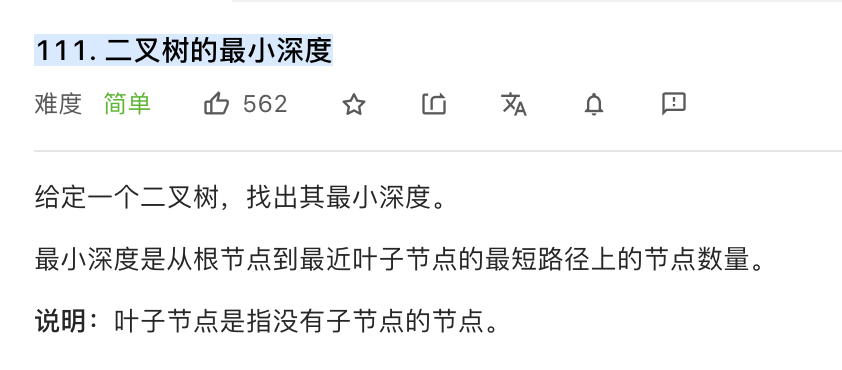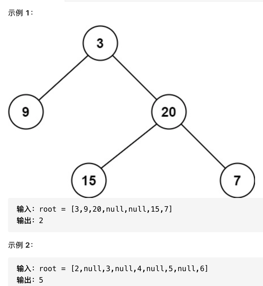 // /** // * Definition for a binary tree node. // * struct TreeNode { // * int val; // * TreeNode *left; // * TreeNode *right; // * TreeNode() : val(0), left(nullptr), right(nullptr) {} // * TreeNode(int x) : val(x), left(nullptr), right(nullptr) {} // * TreeNode(int x, TreeNode *left, TreeNode *right) : val(x), left(left), right(right) {} // * }; // */ // class Solution { // public: // int minDepth(TreeNode* root) { // int depth =INT_MAX; // if(root==NULL) // 节点为空,深度为0 // return 0; // if(root->left==NULL&&root->right==NULL) // 左右子树为空,深度为1 // return 1; // // 其他情况,分别对左右子树递归判断 // if(root->left) depth = min(minDepth(root->left), depth); // if(root->right) depth = min(minDepth(root->right), depth); // return depth+1; // //return min(minDepth(root->left), minDepth(root->right))+1; // } // }; /** * Definition for a binary tree node. * struct TreeNode { * int val; * TreeNode *left; * TreeNode *right; * TreeNode() : val(0), left(nullptr), right(nullptr) {} * TreeNode(int x) : val(x), left(nullptr), right(nullptr) {} * TreeNode(int x, TreeNode *left, TreeNode *right) : val(x), left(left), right(right) {} * }; */ class Solution { public: int minDepth(TreeNode* root) { int depth = INT_MAX; if(root==NULL) return 0; if(root->left==NULL&&root->right==NULL) return 1; // 其实下面四句话有三层意思, // 如果左子树为空,则最后返回的depth+1,就是右子树的高度+1 // 如果右子树为空,则最后返回的depth+1,就是左子树的高度+1 // 如果两个数都不为空,则最后返回的depth+1,就是左子树与右子树高度的较小值+1. if(root->left) depth = min(depth,minDepth(root->left)); if(root->right) depth = min(depth, minDepth(root->right)); return depth+1; } };