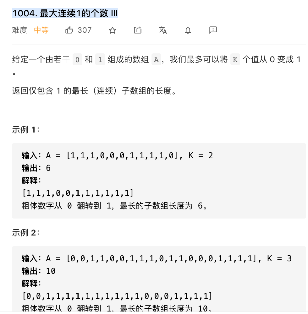 class Solution { public: int longestOnes(vector<int>& nums, int k) { unordered_map<int,int> un_map; int sum = 0; int i = 0; int j = 0; for(j = 0; j < nums.size(); j++){ sum = sum + nums[j]; // 记录1的个数 if(j-i+1>sum+k){ // 如果当前窗口size大于可维护的窗口大小,收缩窗口 sum =sum -nums[i]; i++; } } return j-i; } };