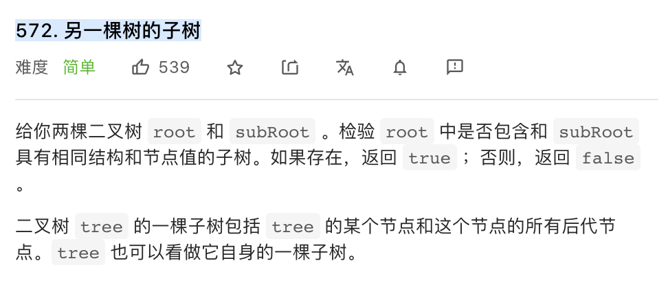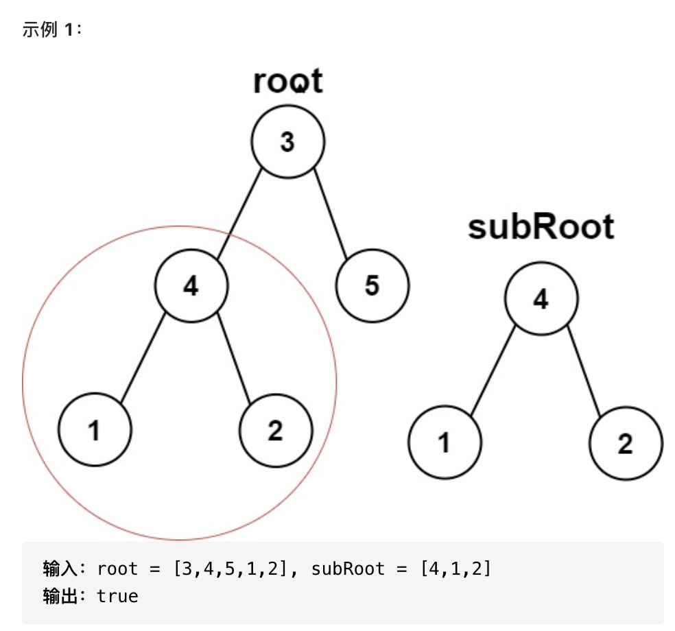/** * Definition for a binary tree node. * struct TreeNode { * int val; * TreeNode *left; * TreeNode *right; * TreeNode() : val(0), left(nullptr), right(nullptr) {} * TreeNode(int x) : val(x), left(nullptr), right(nullptr) {} * TreeNode(int x, TreeNode *left, TreeNode *right) : val(x), left(left), right(right) {} * }; */ class Solution { public: bool isSubtree(TreeNode* root, TreeNode* subRoot) { if(root==NULL||subRoot==NULL) return false; if(root->val!=subRoot->val){ return isSubtree(root->left,subRoot)||isSubtree(root->right,subRoot); }else{ // return judge(root,subRoot); return judge(root,subRoot)||isSubtree(root->left,subRoot)||isSubtree(root->right,subRoot); // 这是为了应对出现有重复元素出现的情况,比如root: 1 1, subroot:1 } return false; } bool judge(TreeNode* root1, TreeNode* root2){ // 这是用来判断子树的 if(root1==NULL&&root2==NULL) // 两个都为空,说明比对完了,返回true return true; if(root1==NULL||root2==NULL) // 其中一个为空,说明一个比完,一个还有,返回false return false; // 如果是判断子结构的就用下面这种方式 // if(root2==NULL) // return true; // if(root1==NULL) // 此时肯定root2不为null,root1为null,所以false; // return false; if(root1->val!=root2->val) return false; else return judge(root1->left,root2->left)&&judge(root1->right, root2->right); } };