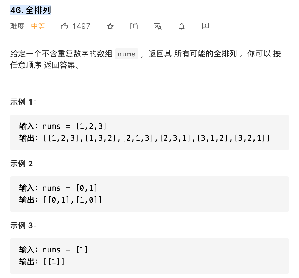 class Solution { public: vector<vector<int>> res; vector<vector<int>> permute(vector<int>& nums) { vector<int> temp; for(int i = 0; i < nums.size(); i++){ temp.push_back(nums[i]); } backtrack(nums,temp,0); return res; } void backtrack(vector<int>& nums,vector<int>& temp, int index){ if(index==nums.size()){ res.push_back(temp); return; } for(int i = index; i < nums.size(); i++){ swap(temp[index], temp[i]); backtrack(nums, temp, index+1); swap(temp[i],temp[index]); } } };
